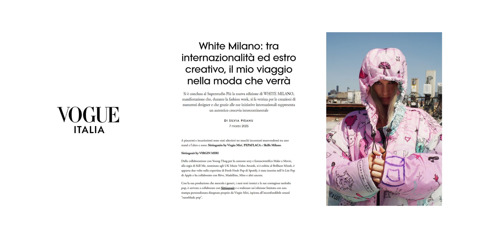 The Swedish, New York-based multi-hyphenate is no stranger to defying norms. With distorted synthesizers and a saccharin voice, Virgin Miri is the perfect paradox – This limited-edition Sittingsuit features a custom print designed by Virgin Miri, inspired by the artist's unique "razorblade pop" sound. This collaboration goes beyond mere aesthetics, aiming to capture the essence of Virgin Miri's music in a tangible, wearable form.